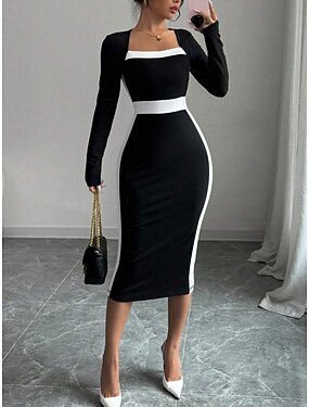Per donna Abito Midi Abito aderente Abiti semi formali Ufficio Vestibilità regolare Blocco di colori Manica Lunga Collo quadrato Nero Blu marino Primavera Autunno