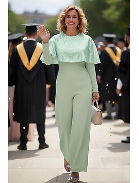Tute Lunghezza al pavimento Tuta Abito da cerimonia per signora Manica Lunga Girocollo Elegante Semplice Ospite di nozze Serata Formale Tessuto Elasticizzato con Paillettes Tinta unita