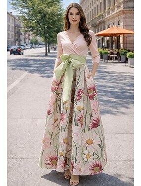 Linea ad A Lunghezza al pavimento Abito da Sera Elegante Vintage Floreale Manica 3/4 Scollo a V Festa in giardino Matrimonio Raso con Stampa floreale Pieghe Tasca