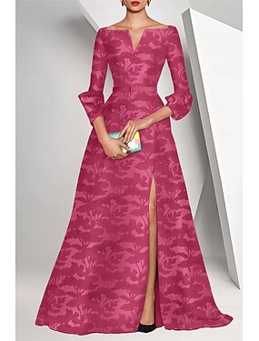 Linea ad A Lunghezza al pavimento Abito da Sera Da principessa Abito formale Elegante Spacco Alto Setoso Manica Lunga Scollo a V Matrimonio Formale Tasca Raso Jacquard con Tasca