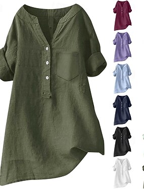 Per donna Camicie di cotone e lino Ricamato Bottoni Tinta unica Essenziale Casual Manica 3/4 Girocollo Top Regolari Quotidiano Blu Rosa Albicocca Estate