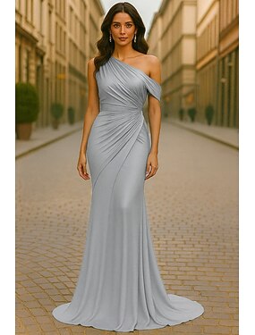 Sirena Tromba Strascico a Terra Abito da Sera Elegante Senza Maniche Monospalla Matrimonio Formale Vestito Rosa Raso Elasticizzato con Arricciato