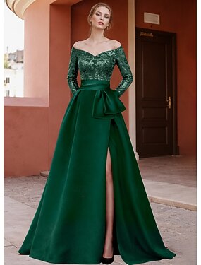 Linea ad A Lunghezza alla caviglia Abito da Sera Elegante Floreale Spacco Alto Manica Lunga Senza Spalle Matrimonio Formale Raso Tulle con Ricamo Applicazioni