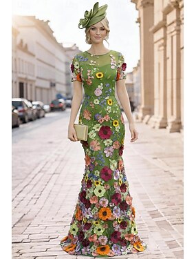 Tubino Colonna Lunghezza al pavimento Abiti da Cocktail Abiti da Ballo Abito da Sera Da principessa Elegante Vintage Manica 3/4 Collo gioiello Formale Chiffon con Volant Fiore sulla Spalla