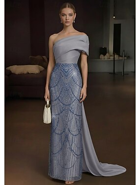 Tubino Colonna Lunghezza al pavimento Abito da Sera Elegante Scintillante Spacco Alto Manica 3/4 Monospalla Matrimonio Formale Tessuto metallico Tessuto Elasticizzato con Arricciato Volant Spacco