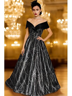 Linea ad A Lunghezza al pavimento Abito da Sera Abito formale Elegante Scintillante Brillanti Manica Corta Senza Spalle Matrimonio Formale Tessuto Lurex con Glitter Paillettes
