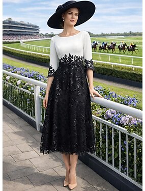 Linea ad A Lunghezza Tè Vestito da Festa Abito da Cocktail Abito da invitata a nozze Abito da cerimonia per signora Mezza Manica Collo gioiello Elegante Vintage Ospite di nozze Ricevimento di