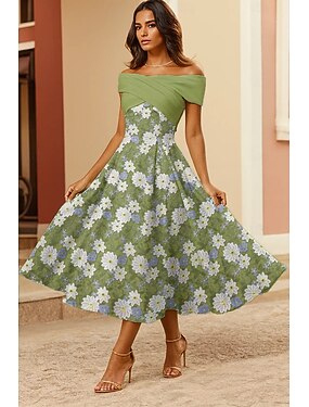 Linea ad A Lunghezza Tè Abiti da Cocktail Elegante Floreale Manica Corta Scollo a Barca Festa in giardino Matrimonio Tasca Raso con Stampa floreale