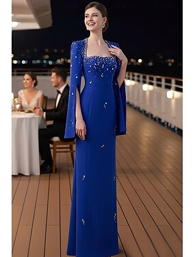 Abito Formale Floor Length Sheath Column Abito da Sera Abito da Sera Elegante Vintage Maniche Lunghe Collo a Giro Sera Festa Matrimonio con Cristalli di Strass e Perline