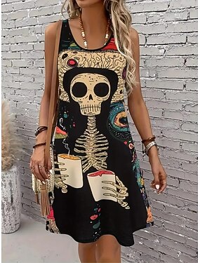 Abito Mini da Donna Stampa Teschi Abito A Linea Casual Quotidiano Festivo Vestibilità Regolare Teschio Senza Maniche Spaghetti Strap Nero Bianco Vino Ruggine Estate Primavera Autunno