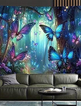 Arazzo da parete con farfalle, estetica, foresta incantata, paesaggio misterioso luminoso, per camera da letto, soggiorno, dormitorio, arredamento per la casa