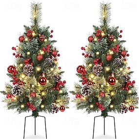 Alberi di Natale artificiali da esterno con luci, 30 pollici, preilluminati, a batteria, decorazioni natalizie per veranda, riempitivi per urne e fioriere, bacche rosse, pigne, palline decorative