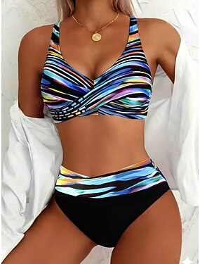 Costume da bagno da donna bikini a 2 pezzi con vita alta moda vacanziera grafica a righe collo V costumi da bagno senza maniche