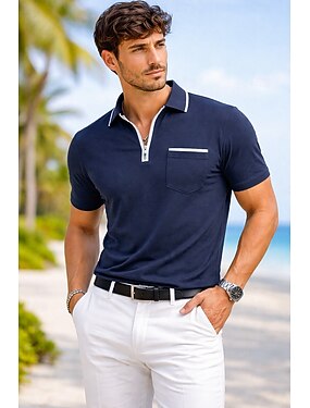 Per uomo Polo con zip Maglia da golf Casuale Fitness Bavero Zip a un quarto Manica Corta Moda Moderno Tinta unica Cerniera Tasca Estate Primavera Tutte le stagioni Bianco Borgogna Blu marino Polo con