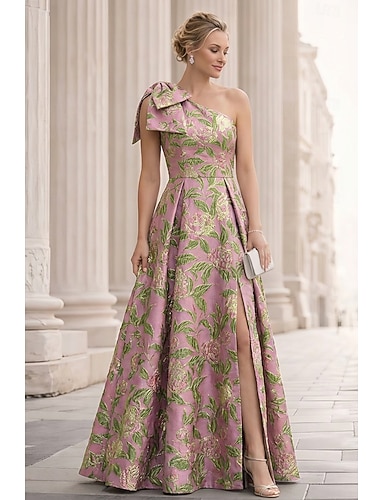 Linea ad A Lunghezza al pavimento Abito da Sera Elegante Senza Maniche Monospalla Matrimonio Formale Tasca Jacquard Shiena scoperta con Fiocco/Fiocchi Pieghe Spacco