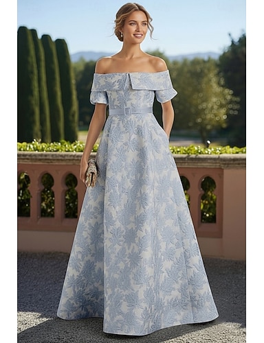 Linea ad A Lunghezza al pavimento Abito da Sera Elegante Manica Corta Senza Spalle Matrimonio Formale Tasca Jacquard con Tasca