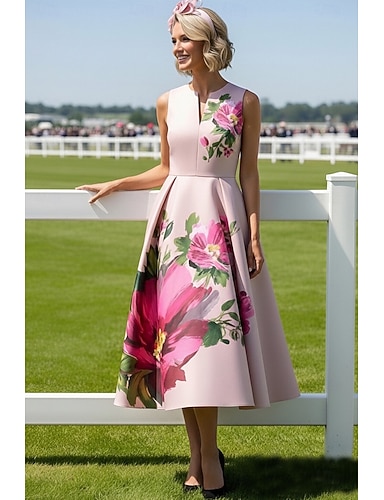 Linea ad A Lunghezza Tè Abito Derby Abito da cerimonia per signora Senza Maniche Scollo a Barca Elegante Vintage Derby del Kentucky Raso con Fiore Stampa