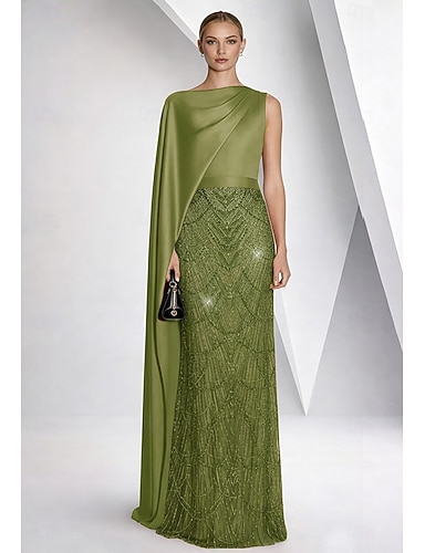 Tubino Colonna Lunghezza al pavimento Perline ricamate Abito Formale Abito da madre della sposa Abito da ballo con mantello Abito da Sera Abito formale Elegante Vintage Scintillante Senza Maniche