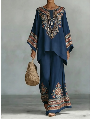Per donna Camicia Set di biancheria in cotone Set di Pantaloni Manica Lunga Manica a Campana Girocollo Grafico Paisley Stampato Vacanza Moda Streetwear Casuale Quotidiano All'aperto Bianco Blu marino