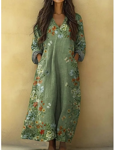 Per donna Abito maxi Vestito Estivo Abito a trapezio Vacanza Casual Boho Spiaggia Uscire Vestibilità comoda Floreale Grafico Manica Lunga Scollo a V Verde chiaro Verde Cachi Estate Primavera