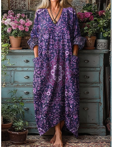 Per donna Abito lungo maxi Abito Boho Vestito Casual Abito Stampato Vintage All'aperto Vacanza Weekend Vestibilità comoda Floreale Grafico Manica Lunga Scollo a V Viola Estate Primavera Autunno