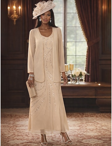 Due Pezzi Tubino Colonna Lunghezza alla caviglia Perline ricamate Abito da invitata a nozze Abito Formale Abito da cerimonia per signora Manica Lunga Scollo a V Elegante Brillare & Splendere Ospite