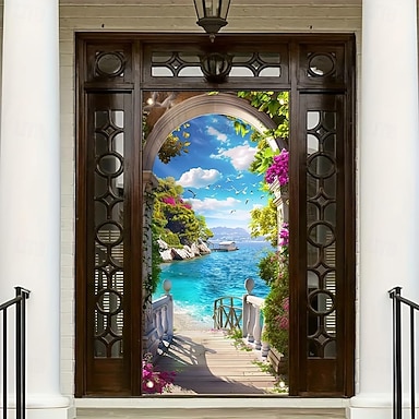 Striscione per porta con vista sulla spiaggia mediterranea, 3D, arco in pietra, paesaggio tropicale dell'oceano, arazzo da parete per ingresso, camera da letto, arredamento per la casa