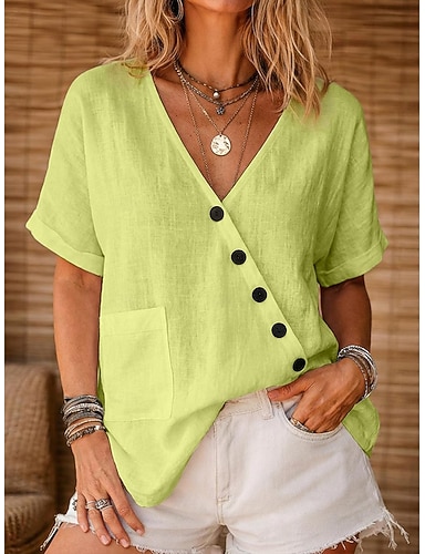 Per donna Blusa Finto cotone e lino Arricciato Bottoni Tinta unica Elegante Casual Manica 3/4 Scollo a V Top Regolari Quotidiano Giallo Rosso Viola Verde Estate