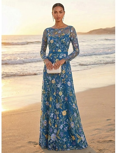 Tubino Colonna Lunghezza al pavimento Abito da invitata a nozze Abito Formale Abito da sera Abito da cerimonia per signora Mezza Manica Collo gioiello Elegante Ospite di nozze Raso Pizzo con Ricamo
