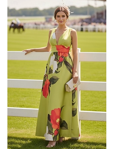 Linea ad A Lunghezza al pavimento Abito da invitata a nozze Abito Formale Abito Derby Abito da cerimonia per signora Senza Maniche Scollo a V Elegante Formale Ferie Derby del Kentucky Raso con Fascia