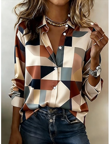Per donna Camicia Bottoni Stampato Grafico Geometrico Elegante Moderno Casual Manica Lunga Colletto a Camicia Top Regolari Quotidiano Lavoro Rosso Cachi Estate Primavera