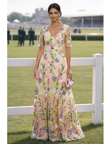 Linea ad A Lunghezza al pavimento Vestito maxi Abito da invitata a nozze Abito da cerimonia per signora Manica 3/4 Scollo a V Elegante Vintage Formale Raso Pizzo Organza con Stampa floreale Ricamo