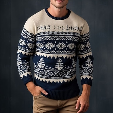 Natale Per uomo Maglione Fair Isle Maglione Maglieria Girocollo Casual Vacanza Quotidiano Stampa 3D Tenere al caldo Manica Lunga Primavera Autunno Inverno Blu