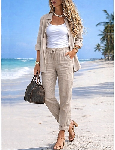 Per donna Set di Pantaloni Bolero Finto cotone e lino Manica Lunga Colletto a Camicia Tinta unica Moda Streetwear Casuale Quotidiano All'aperto Bianco Cachi Grigio scuro Estate Vestibilità regolare