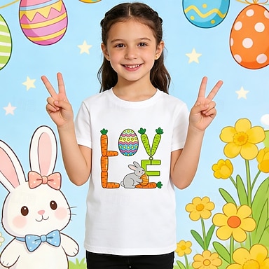 100% Cotone Pasqua Bambini Ragazze Bianco Amore Coniglio Maglietta Girocollo Manica Corta Quotidiano All'aperto Abbigliamento casual alla moda Vacanza Moda Casual Stampa Estate Primavera