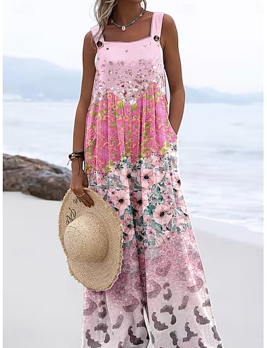 Per donna Salopette Attivo Floreale Senza Maniche Senza maniche Gamba larga Collo quadrato Tasca Bottoni Quotidiano Spiaggia Vestibilità comoda Blu Rosa Viola Estate
