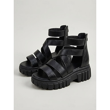 Sandali gladiatore neri da donna con plateau - sandali robusti con cinturini, suola carrarmato e cerniera posteriore, perfetti per festival musicali all'aperto, rave party e streetwear di tendenza.