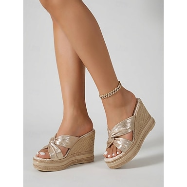 Sandali con zeppa da donna color oro metallizzato - eleganti espadrillas con nodo intrecciato, perfette per vacanze su isole e matrimoni in spiaggia. &vacanze estive glamour