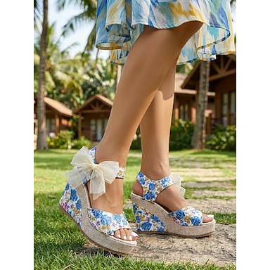 Sandali con zeppa da donna blu acceso con stampa floreale - comodi sandali espadrillas con plateau e cinturino alla caviglia con fiocco, ideali per resort all'aperto, vacanze tropicali e matrimoni estivi in giardino.