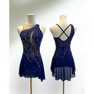 abito da pattinaggio artistico, abito da pattinaggio sul ghiaccio da donna e da ragazza, blu navy, schiena scoperta, orlo asimmetrico, maglia ad alta elasticità, abbigliamento da pattinaggio per
