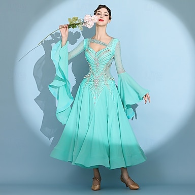 Abito da ballo da sala da donna elegante, turchese, con collo alto, decorato con strass, per valzer, tango, rumba moderna, performance