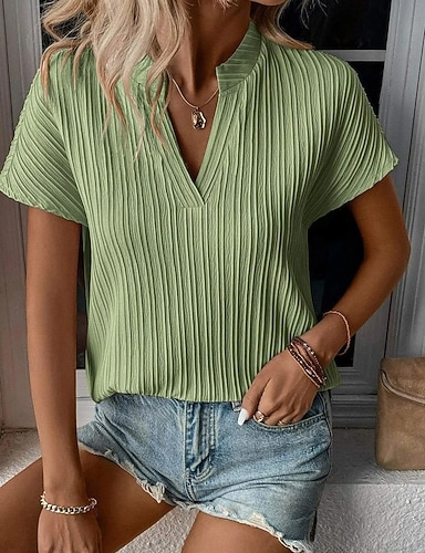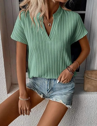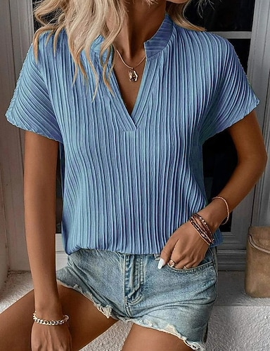 Per donna Camicia Blusa Top in pizzo Patchwork Tinta unica Elegante Classico Moderno Manica Corta Scollo a V Top Regolari Quotidiano Ferie Uscire Blu Nero Vino Arancione Grigio Estate Primavera