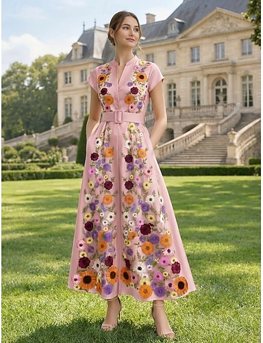 Linea ad A Lunghezza al pavimento Abito Floreale Abito da Sera Elegante Quotidiano Floreale Manica Corta Scollo a V Festa in giardino Matrimonio Tasca Organza Jacquard con Pieghe Spacco