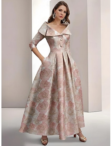 Linea ad A Lunghezza alla caviglia Vestito da Festa Abito da Cocktail Abito da invitata a nozze Abito da cerimonia per signora Manica 3/4 Scollo a V Colletto a Camicia Elegante Vintage Formale Raso