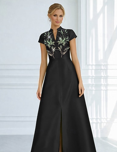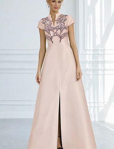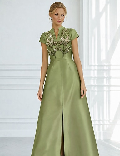 Linea ad A Lunghezza alla caviglia Perline ricamate Abito Formale Abito da madre della sposa Abiti da Cocktail Abiti da festa Elegante Vintage Manica Corta Senza Spalle Matrimonio Formale Raso con