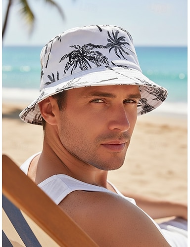 Cappello a secchiello reversibile da uomo in poliestere, cappello da sole con stampa di palme multicolore, berretto da pescatore tropicale casual per la spiaggia, ideale per l'uso quotidiano, i viaggi, le vacanze e lo stile da resort.