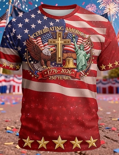 4 luglio 2026 250° Giorno della Memoria Maglietta a Maniche Corte a Collo Rotondo con Stampa 3D Bandiera USA Maschile Quotidiana Street
