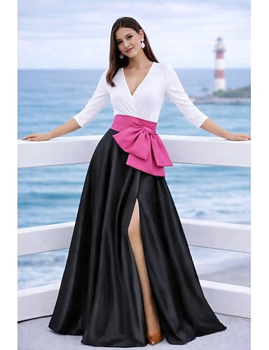 Linea ad A Lunghezza al pavimento Abito da Sera Da principessa Abito formale Elegante Spacco Alto Manica 3/4 Scollo a V Matrimonio Formale Cintura / Fascia Raso con Fiocco/Fiocchi Spacco