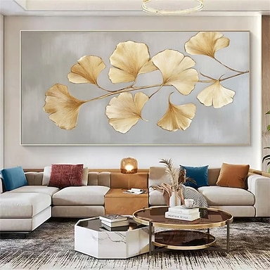 foglie di ginkgo dorate dipinte a mano, pittura a olio su tela, arte murale floreale metallica dipinta a mano, design astratto di foglie, arredamento di lusso per la casa, decorazione moderna su tela