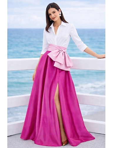 Linea ad A Lunghezza al pavimento Abito Derby Abito da Sera Da principessa Abito formale Elegante Spacco Alto Manica 3/4 Colletto a Camicia Matrimonio Formale Cintura / Fascia Raso con Fiocco/Fiocchi